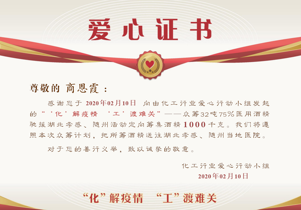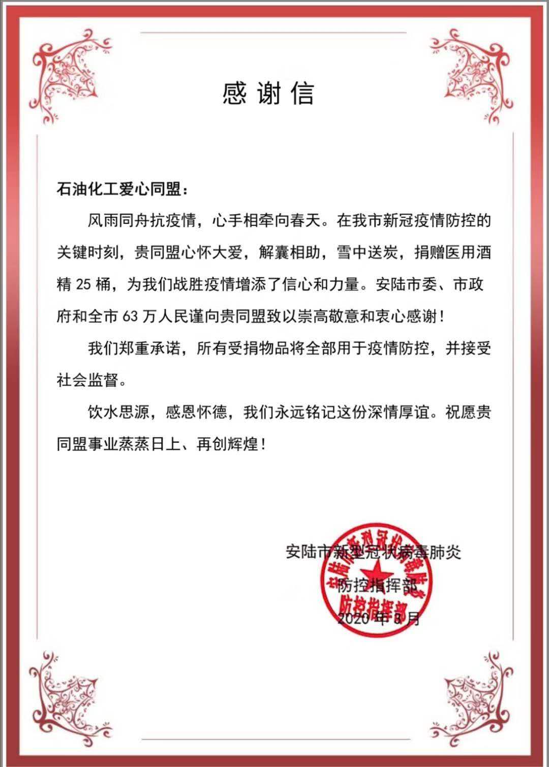 “風雨同舟抗疫情,心手相牽向春天。在我市新冠疫情防控的關鍵時刻,貴同盟心懷大愛,解囊相助,雪中送炭,捐贈醫用酒精25桶,為我們戰勝疫情增添了信心和力量。安陸市委、市政府和全市63萬人民謹向貴同盟致以崇高的敬意和衷心感謝!”2020年3月,湖北省安陸市委、市政府向石油化工愛心同盟發來感謝信,對同盟在抗擊疫情過程中,對安陸市的酒精捐助表示敬意和感謝。