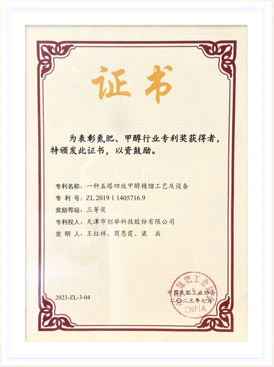 創舉科技自主研發的“一種甲醇五塔四效精餾工藝及設備”發明專利榮獲“2022年度氮肥、甲醇行業專利獎三等獎”。該專利是一種節能型甲醇精餾工藝,在運行過程中減少了新鮮蒸汽和循環冷卻水的消耗量,同時增強塔釜液循環強度,從而達到高效節能的效果。