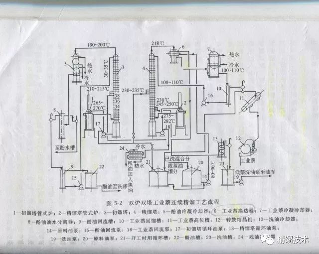 原料(已洗萘洗混合分)于原料槽中加熱到85-90℃,靜止脫水后由原料泵送至熱交換器,與工業萘蒸汽換熱到200℃左右進入初餾塔。由初餾塔頂采出酚油,塔頂蒸汽溫度控制在190-200℃。酚油蒸汽經過冷凝冷卻器冷卻和油水分離器分出油和水后,分離水排入酚水處理系統,酚油進入回流槽,大部分酚油作初餾塔回流,回流比為20-30(對酚油產品),少量從回流槽滿流入酚油成品槽。初餾塔底已脫除酚油的萘洗油用熱油泵送往初餾管式爐加熱至270-275℃,再返回初餾塔底,以油循環方式供給初餾塔熱量。在初餾塔熱油循環過程中,從熱油泵出口管中分出一部分萘洗油打入精餾塔。