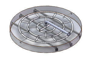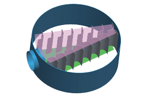 雙列葉片氣體分布器,在大塔徑塔進氣口處設該分布器,重量輕占用塔截面積小,霧沫夾帶量小,氣體分布均勻。該分布器對塔內填料效率的發揮至關重要。該形式的氣體分布器已成功在焦化行業、煉油行業等成功應用,特別是在大塔徑上的氣體分布效果更佳,得到用戶的一致好評。